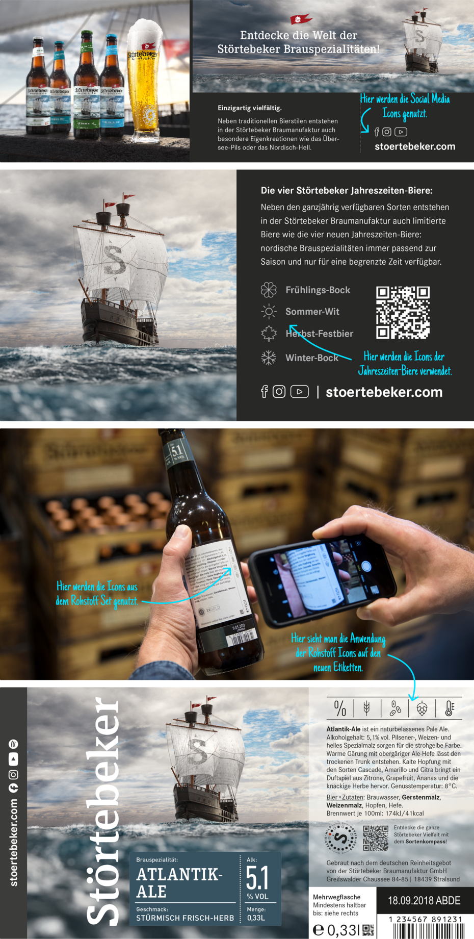 Die Störtebeker Icons sind mehr als bloße Symbole – sie transportieren Haltung, Werte und Herkunft. Mit prägnanter Linienführung, klarer Formsprache und nordischer Gelassenheit stehen sie für Orientierung und Charakter zugleich. Für jede thematische Kategorie wurde ein passendes, stilistisch konsistentes Icon-Set entwickelt – vom Rohstoff über die Verkostung bis zur digitalen Welt. Einheitlich im Aufbau, klar in der Wirkung, vielseitig im Einsatz. Der einheitliche Stil schafft Wiedererkennbarkeit über alle Berührungspunkte hinweg. Dabei sind die Icons bewusst reduziert gestaltet: funktional, ehrlich und unverwechselbar – ohne Schnörkel, aber mit Haltung. Ihre Anwendung folgt klaren Prinzipien: Kontrast, Lesbarkeit und Kontext entscheiden über den Einsatz. Für ein visuelles Erlebnis, das genauso authentisch wirkt wie die Brauspezialitäten selbst.