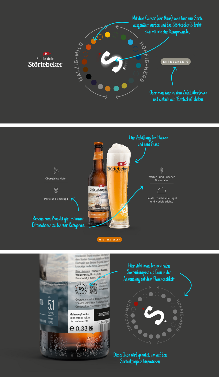Der Sortenkompass verbindet analoge Präsenz mit digitaler Tiefe. Auf den Etiketten findet sich ein reduziertes Kompass-Icon – das Störtebeker S im Zentrum, neutral gehalten. Es verweist über einen QR-Code bewusst auf die digitale Version im Browser oder am POS-Screen. Wer dieses Zeichen erkennt, wird eingeladen, die Vielfalt der Brauspezialitäten interaktiv zu entdecken. Das Icon wird so zur Brücke zwischen Flasche und Erlebnis: Es macht neugierig, regt zum Ausprobieren an – und führt direkt zum digitalen Kompass, wo das eigene Störtebeker nur ein paar Klicks entfernt liegt.